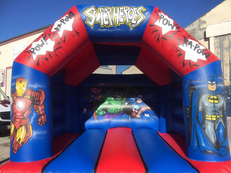Measuring 12ft x 14ft Superheroes bouncy castle with built in raincover . this castle is suitable for a variety of ages.