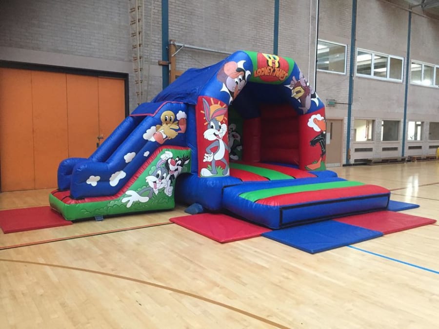 18ft x 14ft Looney Tunes themed bouncy castles slide combo with built in rain cover .