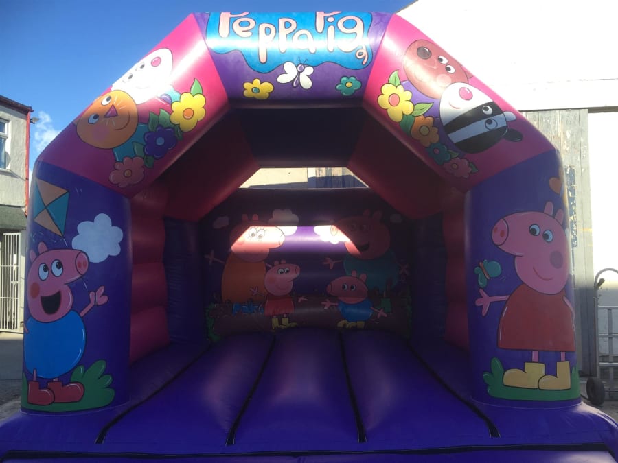 Measuring 12ft x 14ft Peppa Pig themed Bouncy castle with built in rain cover this castle is ideal for garden hire and certain community centres.