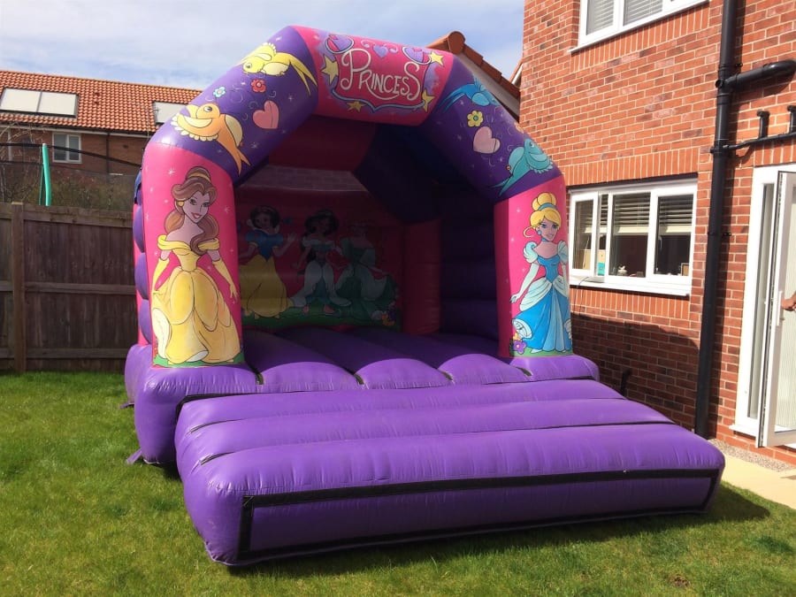 Measuring 12ft x 14ft Princess themed Bouncy castle with built in rain cover this castle is for gardens and certain community centres.