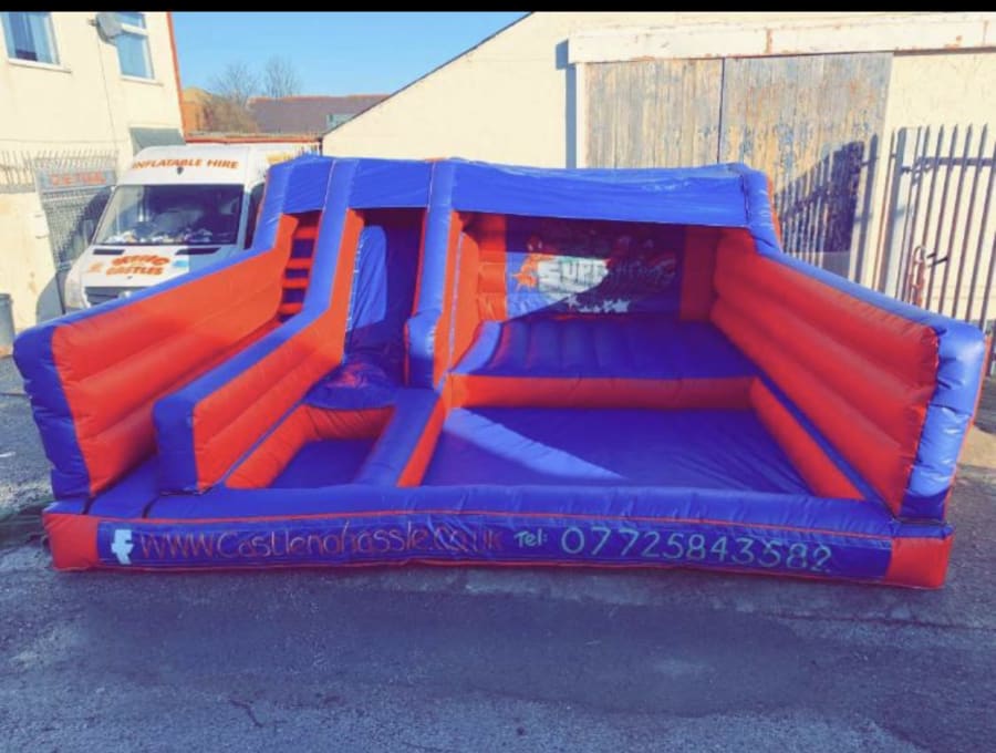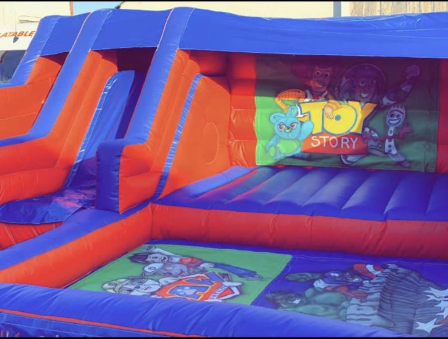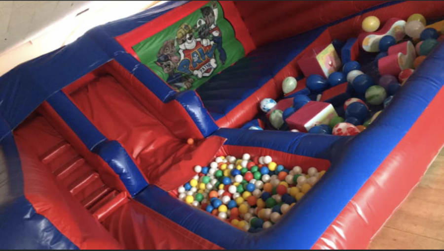 New exclusive to King Of The Castles built in house by our manufacturing team we have this amazing all in one inflatable play park including a 5ft platform slide , ballpool , bouncy castle area 9ft x 6ft and softplay area 9ft x 6ft ( 10 piece soft play included )