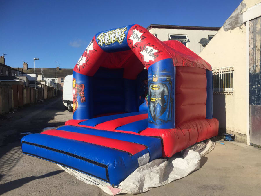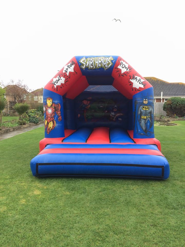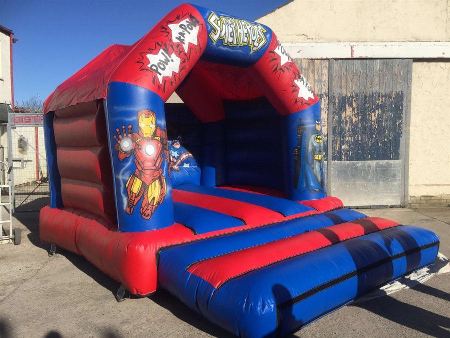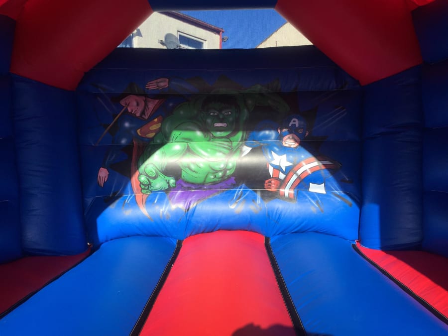 Measuring 12ft x 14ft Superheroes bouncy castle with built in raincover . this castle is suitable for a variety of ages.
