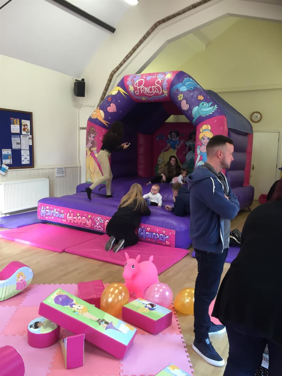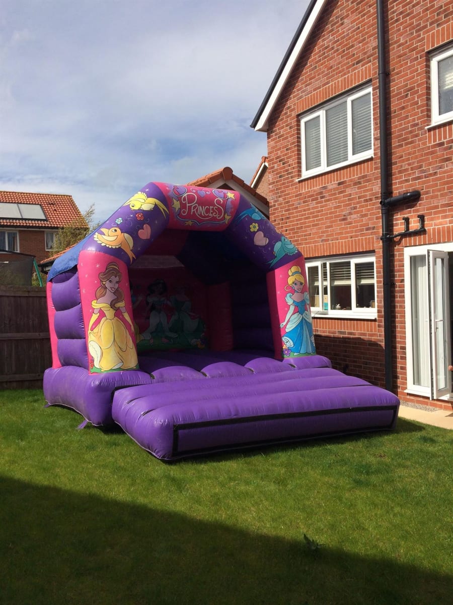 Measuring 12ft x 14ft Princess themed Bouncy castle with built in rain cover this castle is for gardens and certain community centres.