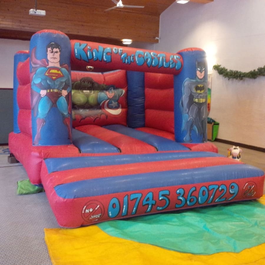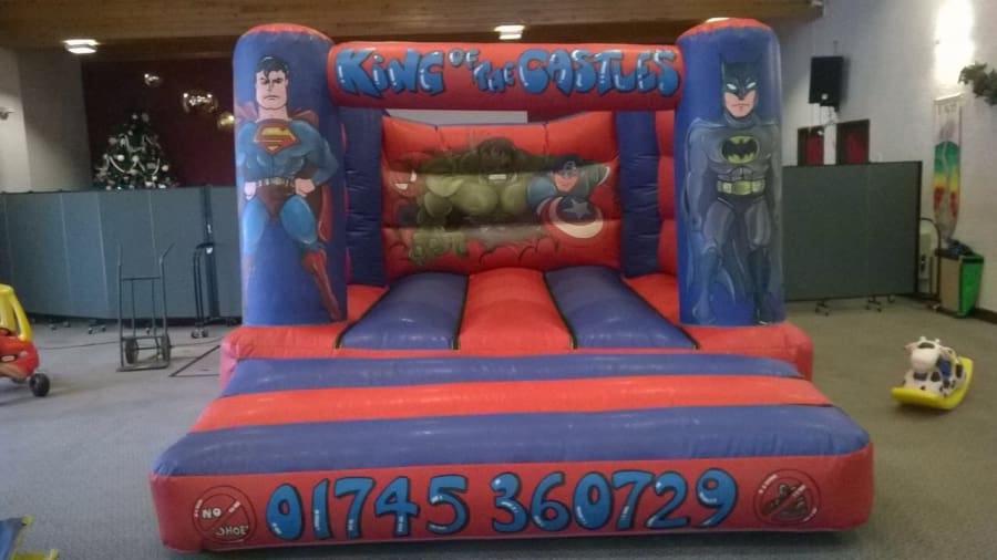 Another unique hand painted Bouncy Castle including the characters Superman, Batman, Hulk, Spiderman and Captain America with a multi coloured blue and red colour contrast to create the complete effect for another truly amazing looking castle.