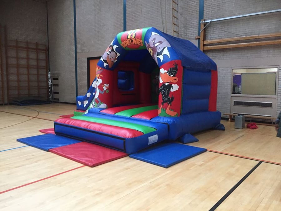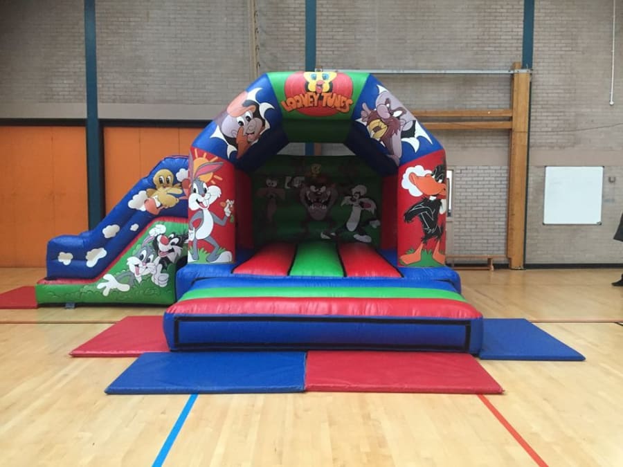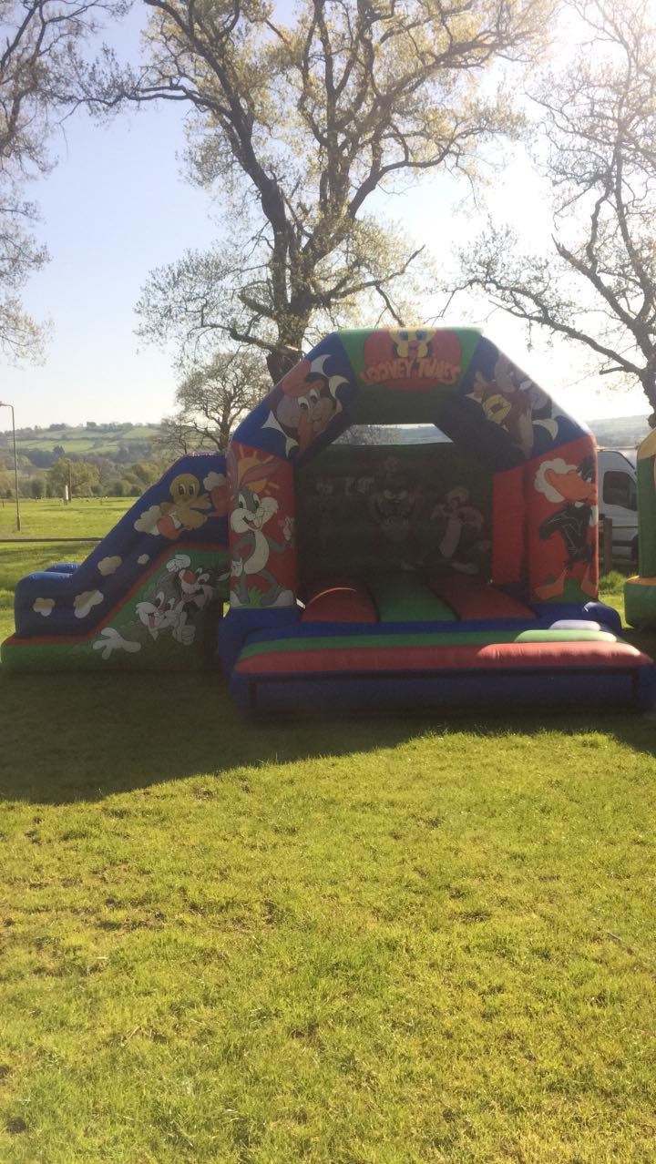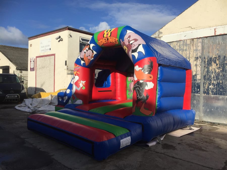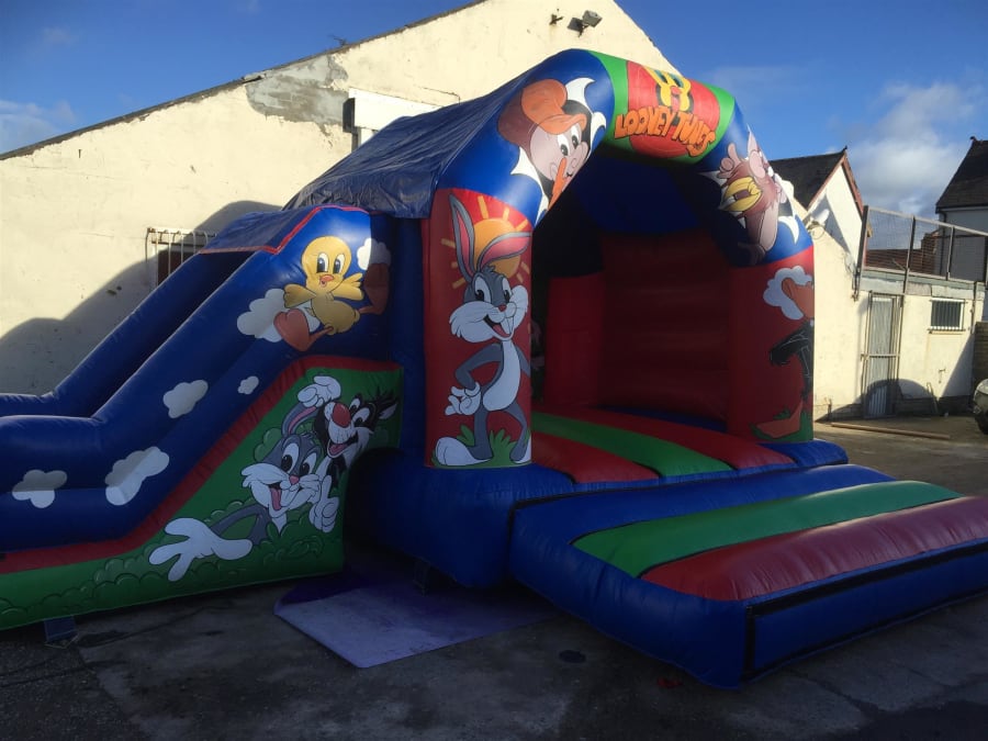 18ft x 14ft Looney Tunes themed bouncy castles slide combo with built in rain cover .