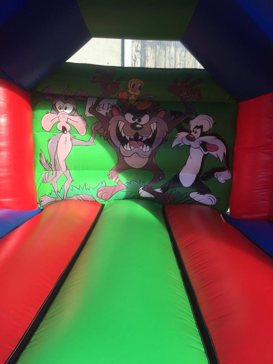 Another unique hand painted Bouncy Castle including the all the looney tunes characters with a multi coloured blue, green and red colour contrast to create the complete effect for another truly amazing looking castle.